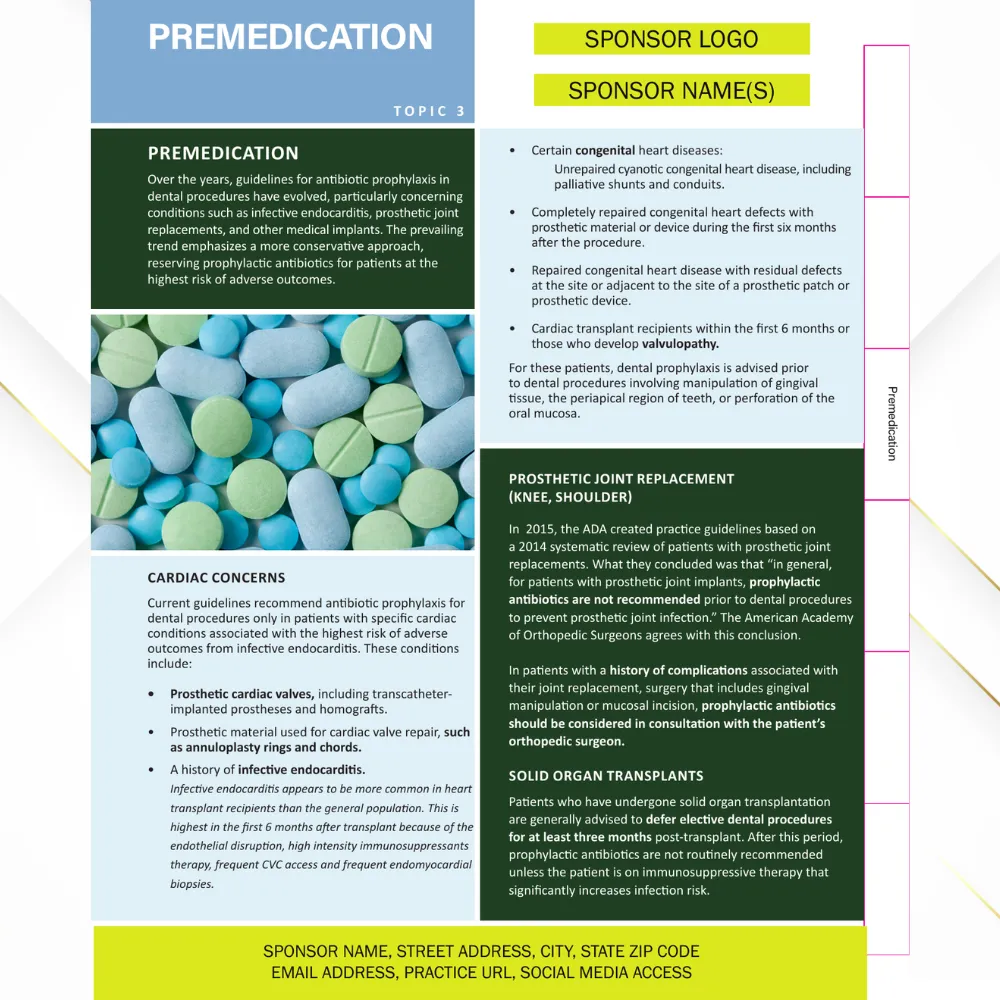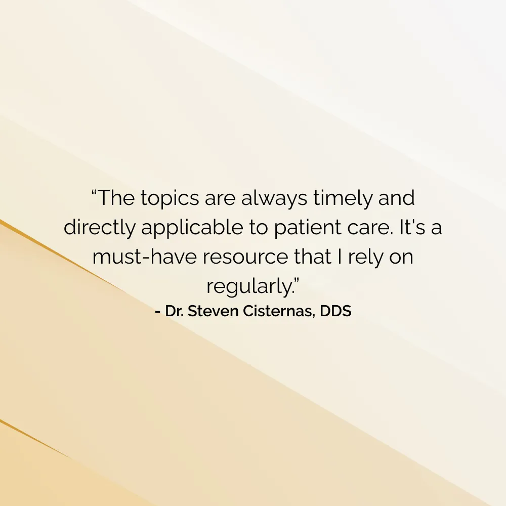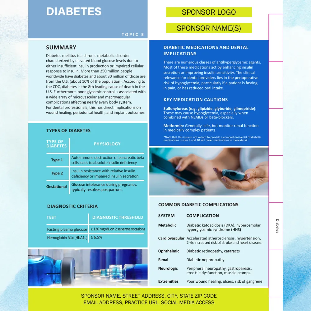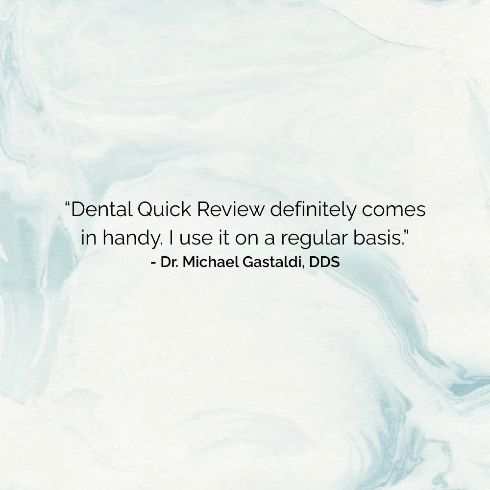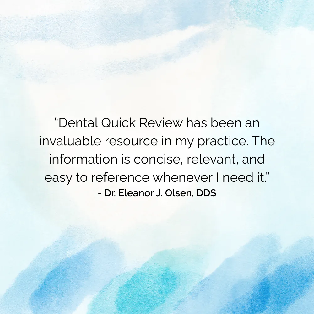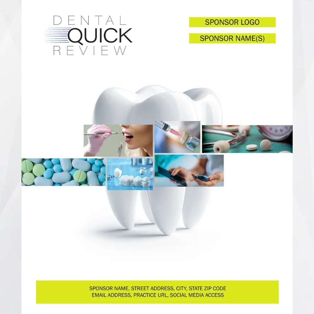 Dental Quick Review (DQR) is a two year, twenty-four topic subscription-based publication that focuses on the medical management of dental patients. The subscriptions are designed for bulk purchase by dental specialists for provision to their general dentist referral network. DQR’s format is designed to provide dentists with quick, current refresher material in a concise and handy way.