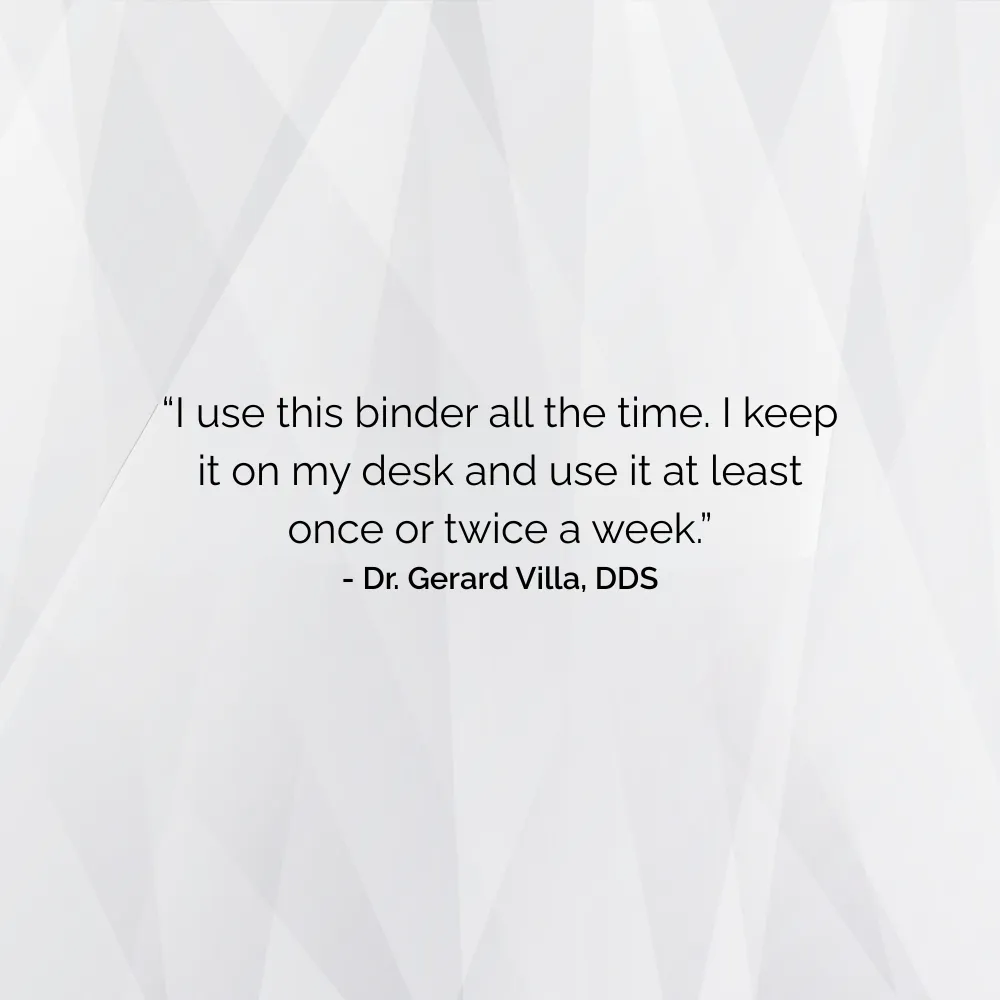 Ongoing contact with referral base: A new medical/dental topic is delivered to each dentist/subscriber via USPS every five weeks for two years. Each content mailer is opened, reviewed and hand-placed in the initially provided DQR 3-ring binder.